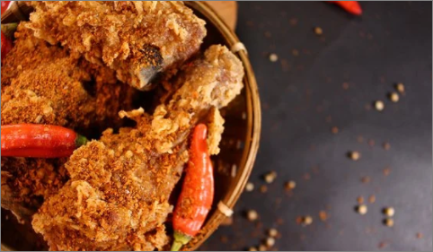 바로 그 음식은 후라이드 치킨과 양념치킨이 각각 들어 있는 반반 치킨 입니다.